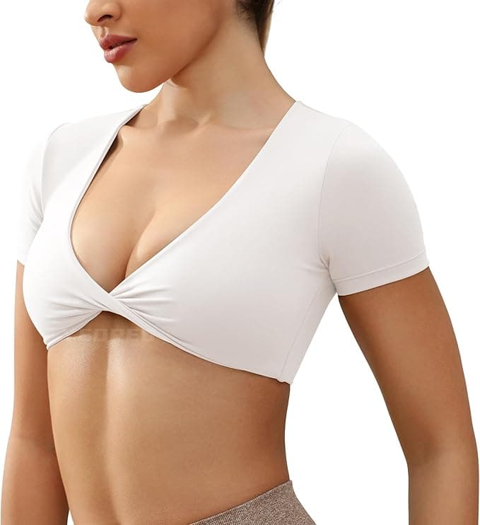 Raw, seductive rebellion: a crisp white short-sleeve crop top with a deep V-neck and dramatic crisscross twist at the front reveals a bold black fishnet panel underneath for teasing texture and contrast. High-waisted white shorts with black trim sit perfectly on the hips, layered over sheer black fishnet tights that extend the edgy vibe down the legs. Black ribbed arm warmers add athletic-punk layering, while a black heart-shaped choker with O-ring hardware delivers the final dominant touch. With short dark hair and glossy lips, this look is confident, provocative, and unapologetically fierce.